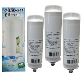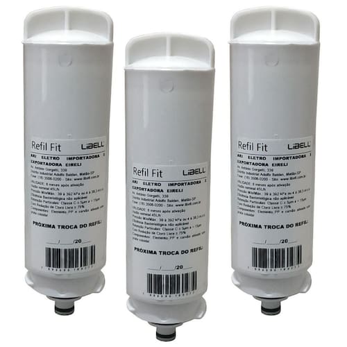 Kit 3 Filtros Refil Libell Purificador de Água Acqua Fit Eletrônico E Hermético Kit 3 Pçs Filtro Refil para os Purificadores de Água Libell AcquaFit - Específico para os modelos: Libell AcquaFit Hermético e Eletrônico As instruções de como realizar a troca vão junto com o produto. É super fácil e rápido realizar a troca do refil você mesmo. O refil retém impurezas da água, reduz odores e gostos estranhos através de um moderno sistema de Tripla Filtragem remove todo tipo de sujeira e impurezas - cloro, ferrugem, terra, areia, entre outras partículas . Sua água fica muito mais GOSTOSA de se beber, muito leve e cristalina. Pode pedir mais peças tranquilamente, pois a validade do filtro enquanto estiver sem uso é indeterminada. A validade só começa a contar após sua instalação. As marcas e produtos citados e ilustrados são propriedades de seus respectivos fabricantes e aparecem apenas para demonstrar a compatibilidade deste produto. Marca do refil: Libell Eficiência da retenção de partículas: Classe III Eficiência da redução de Cloro livre: Aprovado Produto de acordo com a ABNT NBR:16098:2012. total contra defeitos de fabricação por um período de pelo 3 meses. O elemento filtrante pode saturar antes de sua vida útil prevista dependendo das condições da água de onde será instalado, como excesso de barro, areia, ferrugem e outras impurezas sólidas. Marca: Não Informado