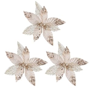 Leve sofisticação e brilho à sua decoração natalina com esta flor bico de papagaio luxo, confeccionada em veludo champanhe mescla com detalhes em tela decorada, glitter e lantejoulas, que proporcionam um efeito refinado e elegante.