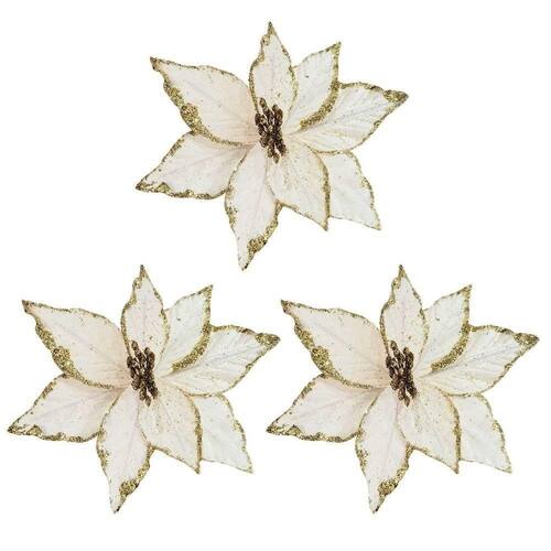 Com 18cm de diâmetro, a flor possui haste para fixação prática, garantindo firmeza e versatilidade na montagem. É ideal para composições natalinas refinadas e para criar arranjos únicos com um toque de requinte.
