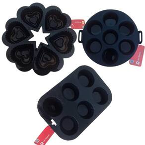 Kit 3 Formas De Silicone Bolo Bolinho Cupcake Escolha a Cor Cor: Preto Kit contendo 3 Formas de Silicone para Bolo, Mini Bolo, Cupcake disponível em 3 cores Cinza, Preto e Vermelho . Escolha a cor de sua preferência e adicione no carrinho de compras.