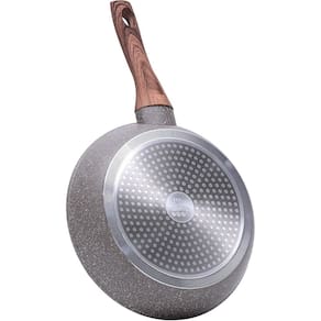 A frigideira da linha Mármol Cook da Rmais Shop é o item ideal para compor sua cozinha com seu design clean, moderno e sofisticado. A panela possui 3 camadas, sendo duas de revestimento cerâmico e uma camada resistente a altas temperaturas. Com estrutura de alumínio as panelas possuem 4mm de espessura que proporciona uma maior durabilidade do produto, como também mais uniformidade térmica, cozinhando os alimentos de maneira uniforme, sem variações de temperatura. Sem contar que elas também mantêm o calor por mais tempo mesmo fora do fogo, possibilitando refeições aquecidas até mesmo à mesa. Com revestimento soft-touch, toque super macio, em seus cabos e alças, confortável ao segurar e previne queimaduras.