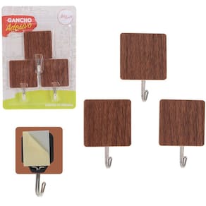 Os ganchos é em material plástico com decoração que remete à madeira e ganchos em aço inox, deixa um ar elegante e sofisticado. Além disso, possui fita adesiva de alta aderência às superfícies.