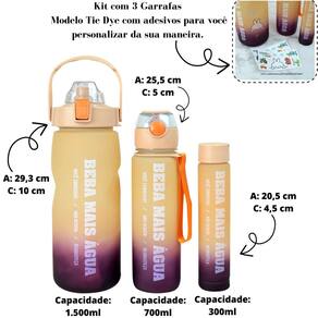 Com esse kit de garrafas você terá em mãos 3 opções de tamanhos: uma garrafa de 1,5litros, outra de 700ml e mais uma de 300ml. As garrafas são todas em tie dye colorido e acompanham adesivos para você personalizar e deixá-la ainda mais bonitas.