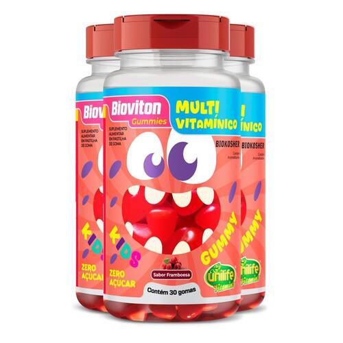 Kit 3 Gummy Kids Multivitamínico Unilife 30 gomas Framboesa GUMMIES - São suplementos em forma de pastilhas de goma, livres de glúten e zero açúcar, com nutrientes diversos que atendem a várias funções no organismo. A goma utilizada é a pectina gelificante e glaceante cera de carnaúba. Os aromas e corantes são naturais e edulcorante isomalte. Multivitamínico Kids - Formulado com vitaminas e minerais necessários ao crescimento e desenvolvimento saudável da criança. Auxilia no aumento da imunidade infantil. Produto autorizado para comercialização em todo o território nacional através da RDC 240/2018 da ANVISA. AFE do MS 6.02234-1. Marca: Não Informado