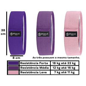 3 Hip Mini Bands Basic Tensão Leve, Média e Forte Elástico Extensor Cor: Roxo Tamanho: M Gênero: Unissex 3 Mini Hip Bands Light Tensão Leve, Média e Forte As Hip Mini Bands são feitas na medida para você queimar gordura, tonificar e fortalecer a região do quadril, pernas, e glúteos, além de braços e costas Esse é o melhor acessório para diminuir a gordura localizada do culote, já que essas faixas têm a medida perfeita para trabalhar a região de glúteos e coxas. São faixas elásticas circulares largas e reforçadas, além de possuir um sistema antideslizamento na parte interna da band, o que não permite que sua faixa deslize ou enrole. Além disso, as mini hip bands são excelentes para quem deseja ter pernas fortes e tonificadas, pois sua resistência é maior do que as mini bands comuns e por serem grossas. Podem ser usadas na parte superior das coxas. Descrição do Kit: 1 Mini Hip Band Forte1 Mini Hip Band Média1 Mini Hip Band Leve Dimensões: Forte: 38 cm de comprimentoMédia: 38 cm de comprimentoLeve: 38 cm de comprimentoLargura: 8 cm Material: Látex e poliéster de algodão Resistência: Forte: 18 à 22 KGMédia: 12 à 16 KGLeve: 7 à 11 KG Obs.: A variação de resistência gerada pela mini hip band depende do tipo de exercício e do movimento executado pelo praticante. Função Tonificação e Fortalecimento dos Músculos das pernas, glúteos, coxas, braços e costas. Excelente acessório para trabalhar a região de glúteos e a gordura localizada do culote.As mini hip bands são feitas de material elástico de algodão de qualidade premium, robusto e ecológico. Elas são elásticas, confortáveis e resistentes à abrasão, por isso podem ser esticadas repetidamente sem partir. É indicada tanto para mulheres quanto para homens, iniciantes até Atletas. O seu conjunto acompanha uma bolsa de transporte para que você possa levar seu kit para qualquer lugar. Você pode treinar em qualquer lugar a qualquer momento e com uma variação de carga alta. Diferente das mini bands de borracha, elas são feitas de tecido macio e agradável à pele, que não escorrega para cima ou para baixo durante o exercício, pois tem sistema anti deslizamento. Não é necessário reajustar as hip bands durante o treino, seja em exercícios de agachamento ou levantamento terra, elas continuaram firmes Além de serem confeccionadas em tecido respirável, também são super confortáveis. As hip bands de resistência média e forte são indicadas para fortalecer os músculos dos braços, pernas, coxas, bumbum e ombro.As hip bands também ajudam você a manter a posição correta das coxas e pernas durante o exercício, garantindo assim um treino eficiente e seguro, já que as bands estimulam o atleta a se concentrar na forma correta de realizar levantamentos mais difíceis. As mini hip bands podem criar resistências variáveis, imitando o que é conhecido como curva de força do músculo. Para quem são indicadas Indicadas para treinos funcional, crossfit, pilates, yoga, musculação ou atividades fisioterápicas, as mini hip bands são as novas aliadas para um treino completo.