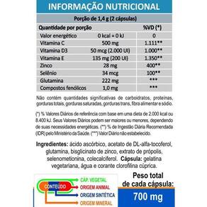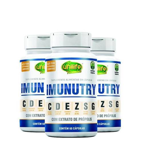 Kit 3 imunutry zinco, selênio, glutamina, própolis e vitaminas c, d e e unilife 60 cápsulas Desenvolvido a partir de vitamina c 500 mg, vitamina d3 2.000 ui, vitamina e 200 ui, zinco 28 mg, selênio 34 mcg, glutamina 222mg e extrato de própolis, com cápsula vegetal gelatina vegetal e água , o produto é livre de glúten e lactose e está disponível na versão: 60 cápsulas. Você o encontra nas melhores lojas de produtos naturais/farmácias ou e-commerces lojas virtuais . Modo de ingestão: sugere-se a ingestão de 1 cápsula 2 vezes ao dia. Ingerir com líquido. Peso total da cápsula: 700mg 500 mg de vitamina c, 2.000 ui de vitamina d3, 200 ui de vitamina e, 28 mg de zinco, 34 mcg de selênio e 222 mg de glutamina na porção de 2 cápsulas Marca: Não Informado Ean: 7908609505731