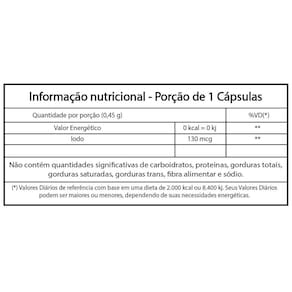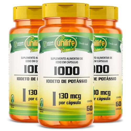 Kit 3 Iodo Iodeto de Potássio Unilife 60 cápsulas Sobre o produto O Iodeto de Potássio é um sal branco cristalino, em fotografia e tratamento radioterápico. Benefícios O iodo auxilia no metabolismo energético O iodo contribui para a manutenção da pele Modo de usar Sugere-se a ingestão de 1 cápsula ao dia, após as refeições. Ingerir com líquido. Este produto é indicado para o grupo populacional com 9 anos ou mais. Este produto não é um . Mantenha fora do alcance de crianças. Não exceder a recomendação diária de consumo indicada na embalagem. Ingredientes Odeto de potássio, antiumectantes estearato de magnésio e dióxido de silício, excipiente .S.P 450 mg. Cápsula: Gelatina vegetal, água purificada e corante natural clorofila. Alergênicos Não contém Glutén Livre de Lactose Código Anvisa Produto autorizado para comercialização em todo território nacional através do anexo I da RDC 240/2018. AFE do MS 6.02234-1 Marca: Não Informado Ean: 7908609529164