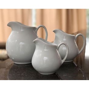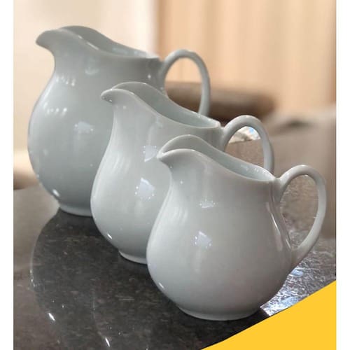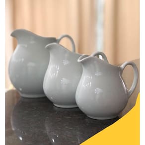 Kit 3 Jarras Leiteiras P-M-G, Sucos e Bebidas - Porcelana Branca (2) Peças de porcelana feitas de material de alta qualidade, queimados em alta temperatura, o que os torna fortes, resistentes e com alto brilho, e deixa qualquer ambiente mais bonito e moderno. A porcelana tem uma enorme vantagem sobre outros materiais, pois é fácil de limpar e não absorve cheiro, o que deixa a peça e o ambiente livre de mal cheiro. Ótima para servir Sucos, Refrigerantes e bebidas em geral São resistentes ao forno e micro-ondas. Cor Branca Dimensões: Jarra P: 350 ml Jarra M: 650ml Jarra G: 1,4L OBS: Peças de porcelana Legitima de 2ª linha. "Contêm pequenas marcas que não afetam na utilização do produto". Pode haver variação de tonalidade entre as peças devido a diferentes lotes de queima. Embalagem contêm 3 peças Marca: Antilope Decor Porcelanas