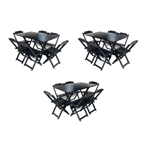 Kit 3 Jogos De Mesa Dobravel Com 6 Cadeiras De Madeira 120x70 Para Restaurante E Bar - Preto O produto é ideal para bares, restaurantes, estabelecimentos, áreas de lazer e também para sua casa. Feito em madeira maciça, tornando resistentes e duráveis. Seu design permite que seja encaixado em qualquer ambiente, trazendo um toque a mais para seu estabelecimento. Além de sua durabilidade, o que lhe trará conforto para servir seus clientes. Por ser dobrável torna-se mais fácil guardar, manusear e limpar o produto.