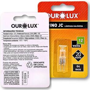 Kit 3 lampadas halogena bipino jc 20w 12v g4 - ourolux Lampadas halogena bipino jc 20w 12v g4 - ourolux Descrição do produto Transforme seu espaço com a potente lâmpada halógena bipino de 20w e 12v jc. Ideal para iluminar ambientes como salas, cozinhas e áreas externas, esta lâmpada oferece uma luz brilhante e clara, perfeita para destacar detalhes e criar atmosferas aconchegantes. Características principais - potência: 20w para uma luminosidade intensa. - voltagem: funciona em 12v, ideal para sistemas de baixa tensão. - base: bipino jc g4, fácil de instalar em diversas luminárias. - durabilidade: vida útil prolongada em comparação com lâmpadas incandescentes. - fabricante: ourolux - : 3 meses - tamanho do produto: 2,5cm altura x 5mm de largura - cor da luz: 3000k - validade: indeterminada - forma da lampada: vela - soquete: g4 ou gy6.35 - composição: metal, vidro e gás halógeno. Vantagens - proporciona uma luz clara e vibrante, ideal para realçar a beleza de seus espaços. - consumo eficiente de energia, ajudando você a economizar na conta de luz. - design compacto que se adapta perfeitamente a spots de iluminação e luminárias decorativas. Observações: produto com tensão de 12v. Não utilizar em lugares que possuem tensão 100-240v. Sugestão de uso: Oficinas mecânicas, baterias e embarcações. / utilizar em ambientes cobertos.
