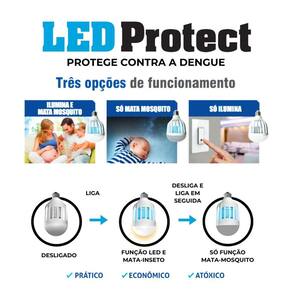 Kit 3 LED PROTECT 220v Ilumina 9W Atrai e Mata Mosquitos Sem toxicidade Kit 3 Led Protect 220v 9W LED PROTECT 220v atrai com Luz UV azul e mata o mosquito por eletrocussão seja sem nenhuma toxicidade . O dispositivo é associado a uma lâmpada LED normal e possui três modalidades de funcionamento: 1 Lâmpada LED ilumina o ambiente e Luz UV antimosquito atuando em conjunto. 2 Somente Lâmpada LED ilumina o ambiente . 3 Somente a Luz UV antimosquito funcionando. Assim na hora de dormir, ou quando não for necessário a iluminação do ambiente, pode ser somente a função Luz UV antimosquito. Marca: Não Informado