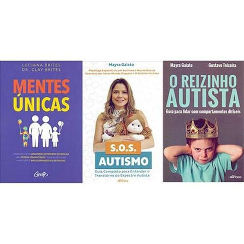 Kit 3 Livros Sobre Autismo Mentes Únicas + Sos Autismo + Reizinho AutistaMentes únicasO autismo é um transtorno de desenvolvimento que afeta de maneira decisiva e predominante nossa capacidade de percepção social. Hoje, estima-se que aproximadamente 1% da população mundial tenha autismo e, infelizmente, esse é um assunto pouco discutido em âmbito nacional. Seja por preconceito ou dificuldade de aceitação, fato é que precisamos estar mais atentos aos primeiros sinais apresentados na infância para conseguir trabalhar de maneira correta com essa condição.Editora : Gente; 1ª edição Idioma : PortuguêsCapa comum : 192 páginasISBN-10 : 8545203071Ano de Publicação: 2019Condição do Item: NovoTipo de Narração: ManualAutor: Luciana Brites, Clay BritesSos autismoQuando falamos em autismo, muitos são levados à imagem de uma criança totalmente isolada, escondida em um canto da casa, fazendo movimentos giratórios com algum objeto e sem responder ao nosso chamado. Poucos, porém, sabem que o Transtorno do Espectro Autista divide-se em níveis de gravidade, com sintomas mais intensos ou mais sutis. Segundo um estudo publicado em 2018 pelo CDC - Center for Disease Control and Prevention, o autismo afeta hoje uma em cada 59 crianças, e o número cresce de forma alarmante. Diante dessa realidade, o livro S.O.S. Autismo: Guia Completo para Entender o Transtorno do Espectro AutistaEditora : Editora nVersos; Português edição Idioma : PortuguêsCapa comum : 256 páginasISBN-10 : 8554862082Ano de Publicação: 2018Condição do Item: NovoTipo de Narração: ManualAutor: Mayra GaiatoReizinho autistaTodas as crianças apresentam comportamentos inadequados no dia a dia. Ensinar condutas adequadas é importante para o bom desenvolvimento. O manejo dessas situações com crianças no espectro autista é diferente, pois existem atrasos na comunicação social, verbal e não-verbal, dificuldade na compreensão dos efeitos que seus comportamentos causam nas outras pessoas, dificuldade em habilidades sociais e rigidez comportamental.Editora : Editora nVersos; Português edição Idioma : PortuguêsCapa comum : 112 páginasISBN-10 : 8554862090Ano de Publicação: 2018Condição do Item: NovoTipo de Narração: ManualAutor: Gustavo Teixeira, Mayra Gaiato