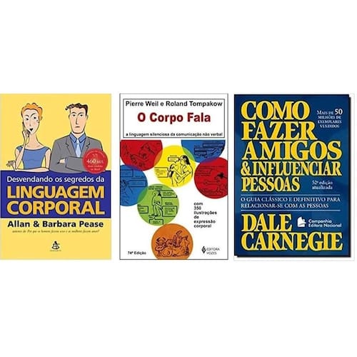 Kit 3 Livros Desvendando Os Segredos Da Linguagem Corporal Um gesto vale mais do que mil palavras. Provavelmente você já ouviu esta frase, mas talvez não tenha se dado conta do quanto ela é verdadeira. Em Desvendando os segredos da linguagem corporal Allan e Barbara Pease esclarecem que 93% da comunicação humana é feita através de expressões faciais e movimentos do corpo. Quando aprendemos a prestar atenção em nossa linguagem corporal e a interpretar corretamente a dos outros, passamos a ter maior controle sobre as situações, pois podemos identificar sinais de abertura, de tédio, de atração ou de rivalidade e agir de forma adequada aos nossos objetivos. Editora : Editora Sextante; 1ª edição 8 agosto 2005 Idioma : Português Capa comum : 271 páginas ISBN-10 : 8575421824 O Corpo Fala O livro tenta desvendar a comunicação não-verbal do corpo humano, primeiramente analisando os princípios subterrâneos que regem e conduzem o corpo. A partir desses princípios aparecem as expressões, gestos e atos corporais que, de modos característicos estilizados ou inovadores, expressam sentimentos, concepções, ou posicionamentos internos. Acompanham 350 ilustrações. Editora : Editora Vozes; 74ª edição 1 janeiro 2015 Idioma : Português Capa comum : 288 páginas ISBN-10 : 8532602088 Como fazer amigos e influenciar pessoas Ao longo de oito décadas, este livro se tornou a referência quando o assunto é o desenvolvimento das relações humanas, das habilidades sociais e da comunicação eficiente. Partindo do princípio de que é preciso se interessar genuinamente por aqueles com quem interagimos, ele mudou a vida de milhões de pessoas, fazendo-as se sentirem mais seguras, abertas e confiantes em seus encontros sociais e profissionais. Com saborosas histórias, exemplos práticos e ótimos conselhos, esta é uma leitura prazerosa e fundamental para quem deseja criar bons vínculos, se tornar mais persuasivo, deixar uma marca positiva e inspirar os outros com energia e gentileza. Editora : Editora Sextante; 1ª edição 8 outubro 2019 Idioma : Português Capa comum : 256 páginas ISBN-10 : 8543108683 Condição do Item: Novo Tipo de Narração: Manual Autor: Allan e Barbara Pease, Pierre Weil e Roland Tompakow, Dale Carnegie Ean: 7890287718308