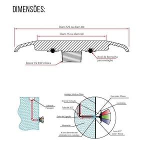 Especificações: - Tecnologia LED SMD; - Ângulo de abertura dos LED's de 120; - À prova d'água (IP68 - uso submerso); - Foi desenvolvida cuidadosamente com materiais de qualidade para garantir alta proteção contra intempéries (cloro, sol, maresia, etc); - Tensão de alimentação: 12vcc estabilizada; - Corpo com 125mm de diâmetro; - Consome 0,75A por luminária.