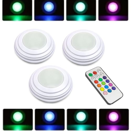 Kit Com 3 Luminárias Lâmpadas Redondas Adesivas A Pilhas RGB Coloridas Led Spots Sem Fio Com Controle Remoto Kit 3 Luminárias Lâmpadas Led Spot Sem Fio Com Controle Remoto, ideal para serem utilizadas em guarda-roupas, armários, gavetas, corredores, varandas, escritórios, quartos, estantes, cabeceiras de camas, toaletes, espelhos, nichos, closets, escadas, balcões, escrivaninhas e em vários locais que necessitam de iluminação colorida sem a necessidade de perfurações, parafusos e cabos. Especificações do produto: - Material: ABS - Formato da luminária: Redonda - Quantidade de led: 3 leds por luminária - Tensão: 4,5V Cada Spot - Fonte de Energia: 3 Três Pilhas AAA para cada spot Pilhas não inclusas - Cor do Produto: Branco - Cor da Luz: RGB Colorida - Potência: 1,2W / 50 LM Cada Spot - Medidas de cada spot: 7 x 3 cm - Medidas do Controle Remoto: 3,9 x 8,5 x 0,6 cm - Modelo da bateria do controle remoto: CR2025 - Distância do controle remoto: Até 5 metros - Peso total de cada kit 3 luminárias: Aproximadamente 130 gramas Atenção: Esse produto não é a prova de água, e também, não deverá ser instalado em lugar úmido, caso contrário, o produto será danificado. Manual Rápido - Coloque 3 pilhas AAA em cada luminária - Solte o lacre Fita transparente do controle remoto para sua operação - Solte e cole um dos lados do adesivo dupla face e fixe na luminária, por fim solte a outra parte do adesivo e fixe no lugar desejado. Observe se o lugar está limpo e adequado para a fixação. - As cores poderão ser operadas de duas maneiras: Uma apertando no centro da luminária ou pelo controle remoto Funções do controle remoto: ON Liga OFF Desliga Multi Color Fica trocando de cores automaticamente TIMER Controla as horas que ficará ligada diretamente MODE Muda a intensidade da cor branca para fraca e forte - Quando o controle não tiver mais funcionando a bateria deverá ser substituída Itens inclusos: - 3 Luminárias spot RGB - 1 Controle remoto - Kit 3 adesivos para fixações das luminárias