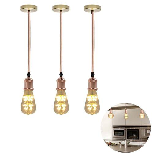 Kit 3 luminárias pendentes soquetes bocais e27 rose gold com lâmpadas vintage formato pera filamento led luzes amarelas Kit 3 pendentes retro fio vintage com três lâmpadas formato pera Os pendentes retro fios, traz estilo para sua casa, beleza e aconchego. Características do produto Materiais do produto:- soquete: metal por fora e por dentro e27 4a 250v t210- base para fixação no teto: metal- fio com acabamento em tecido- tampa: metal- lâmpada: filamento led vintage retro e27 pêra luz amarela Especificação do produto: - tipo de fiação: fio pp - voltagem: bivolt - tampa com ajustador de altura - fio combinando com a cor do pendente - acompanha peças para montagem e instalação do produto - fácil de instalar - soquete com rosca inferior para adaptação em outras luminárias - peso do produto: o kit com os 3 pendentes com as 3 lâmpadas chega a 640 gramas- cor do pendente: rose gold Medidas do produto:- as medidas estão ilustradas na foto do anúncio para melhor compreensão Itens inclusos:- 3 pendentes/bocais com fio- 12 parafusos- 6 buchas de parafusos- 3 base de metal para fixação no teto- 3 tampas- 3 pinos de tampa- 3 lâmpadas formato pera Observação: este produto não acompanha nenhuma lâmpada Marca: Kit Pendente