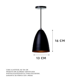 - dimensões: 16x13cm - canopla redonda de 11cm de diâmetro - produto feito em alumínio - 150cm de fio ajustável - pronto para instalação - utilize a lâmpada que desejar - soquete e-27 - garantia de 6 meses contra defeitos de fabricação