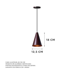 - dimensões: 18x12,5cm - canopla redonda de 11cm de diâmetro - produto feito em alumínio - 150cm de fio ajustável - pronto para instalação - utilize a lâmpada que desejar - soquete e-27 - garantia de 6 meses contra defeitos de fabricação