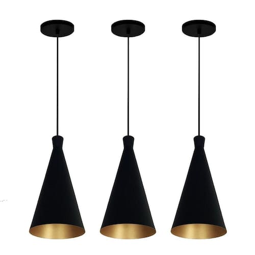 Kit 3 Lustre pendentes Funil Dixon Canadá Preto com Dourado Lustre Pendente Modelo: Tom Dixon Cor: Preto com Dourado Medidas Aproximadas: Altura:29 cm Diâmetro: 17 cm Canópla de teto: 12 cm Soquete e-27 plástico Material: alumínio Marca R.R.J.V Negócios O pendente acompanha 1 Um Metro de fio com altura ajustável. Marca: Rrjv Negocios Ean: 7898970122326