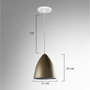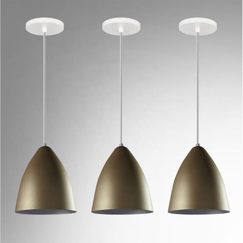 Kit 3 lustre pendentes Vegas Dourado com Branco R.R.J.V Anuncio referente a 3 unidades Lustre Pendente Modelo: Vegas Cor: Dourado com Branco Medidas Aproximadas: Altura: 20 cm Diâmetro: 15 cm Canópla de teto: 12 cm Soquete e-27 plástico Material: alumínio Marca R.R.J.V Negócios O pendente acompanha 1 Um Metro de fio com altura ajustável. Marca: R.R.J.V. Negocios Ean: 7898970122135