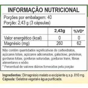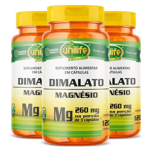 Magnésio dimalato unilife 120 cápsulas Sobre o produto O magnésio dimalato é um suplemento mineral que desempenha diversas funções biológicas, auxiliando na função cardíaca, contração muscular e ativação enzimática. É essencial para o bom funcionamento do organismo e manutenção da boa saúde. Benefícios Consumar o suplemento de magnésio dimalato pode trazer muitos benefícios para a sua saúde, entre eles, auxiliar na boa saúde cardiovascular, melhora na produção de energia, apoio à função muscular e suporte à saúde óssea. Modo de usar Sugere-se a ingestão de 3 cápsulas ao dia, após a refeição. Ingerir com líquido. Ingredientes Magnésio dimalato e excipiente .S.P. 810 mg. Cápsula: gelatina vegetal e água purificada. Alergênicos Não contém glúten. Livre de lactose. Código anvisa Produto autorizado para comercialização em todo o território nacional através do anexo i da rdc 240/2018 da anvisa. Afe do ms 6.02234-1 Marca: Não Informado