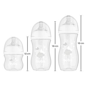 O kit inclui 3 mamadeiras com capacidade de 120ml, 270ml e 330ml e bicos fluxo tamanhos 1,2 e 3.