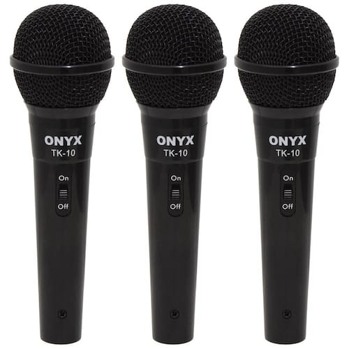 Microfone TK-10 com fio Onyx, produzido em liga e zinco é um microfone durável, com sistema de microfone dinâmico e ótimo custo benefício. É um modelo unidirecional (cardioide) dinâmico, altamente eficaz para uso geral. Testado e aprovado por profissionais do ramo. Aplicações: Palestras, palcos e estúdiosEspecificações- Marca: Onyx- Tipo: Com Fio- Modelo: TK-10- Corpo de liga de zinco- Filtro anti puff- Chave on-off- Conector XLR- Impedância: (1 khz) 700 ohms 30%- Sensibilidade: -72,3 db (0db=1V/pa at 1KHZ)- Capsula: Unidirecional- Frequência de Resposta: 85Hz a 11kHz- Comprimento do Cabo: 3 m- Medidas Aproximadas do Microfone: 5 x 5 x 18 cm- Peso Aproximado do Microfone: 100 gConteúdo da Embalagem- 3 Microfones Dinâmicos com Fio TK 10 Onyx*imagens meramente ilustrativas