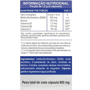 Msm metil sufonil metano + biotina e vitamina unilife 60 cápsulas modo de ingestão: sugere-se a ingestão de 1 cápsula 2 vezes ao dia. Ingerir com líquido. msm é uma forma natural de enxofre orgânico encontrada em todos os organismos vivos. Metade do enxofre presente no corpo se localiza nos músculos e o restante no cérebro, cabelos, unhas, epiderme e ossos. O enxofre é fundamental para a fabricação de colágeno e construção de metionina e cisteína aminoácidos . Junto com as vitaminas b1, b5, b7 e c, a ação do msm é potencializada. este produto é recomendado para um grupo populacional com 19 anos ou mais.