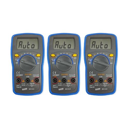 KIT 3 MULTÍMETRO DIGITAL PORTÁTIL TRUE RMS MOD. MD-610 COM MEDIÇÃO INTELIGENTE DE TENSÃO, RESISTÊNCIA E CONTINUIDADE, CAT II–600V, DETECÇÃO DE TENSÃO SEM CONTATO (NCV), TEMPERATURA. FREQUÊNCIA (REDE E LÓGICA), DUTY CICLE E CAPACITÂNCIA DESCRIÇÃO: O multímetro digital portátil True Rms mod. MD-610, possuí um display LCD 3 ½ dígitos e 5999 contagens, indicação de polaridade automática, escala automática, medição de tensão AC/DC, corrente AC/DC, Resistência, Capacitância, Frequência e ciclo de trabalho, Temperatura, Teste de Diodo, Continuidade audível e medição inteligente de tensão AC/DC, resistência e continuidade. Possui indicação de bateria fraca, indicação de medição fora de escala, taxa de amostragem de 3 vezes/segundo, auto desligamento quando este não estiver sendo utilizado e botão HOLD (congela os valores). O Multímetro MD-610, é um aparelho compacto e completo, podendo ser utilizado para as mais diversas finalidades, desde atividade profissionais à estudantes de eletrônica e elétrica. DESTAQUES: Multímetro TRUE RMS, medição inteligente, escala automática de Tensão AC/DC, Resistência e Continuidade, detector de Tensão sem contato (NCV), Medição de Tensão e Corrente AC/DC, Capacitância, Temperatura, Resistência, testes de Continuidade audível, Diodo. APLICAÇÕES: Indústrias, Assistências técnicas, Processos de automação, Projetos eletrônicos, Testes e ensaios de sensores de temperatura, entre outros. ESPECIFICAÇÕES TÉCNICAS: Display LCD 3 ½ dígitos 5999 contagens Taxa de amostragem aprox. 3 vezes/segundos Indicação de sobre escala: “OL” categoria de segurança: CAT II - 600V Indicação de carga de bateria baixa Teste de diodo Teste de continuidade audível Detector de tensão sem contato (NCV) Desligamento automático Congelamento de dados Escala automática Botão seletor de função Tensão DC Faixa: Escala: 600mV, 6V, 60V, 600V Precisão:±(0,5% leitura + 2 dígitos), ±(0,8% leitura + 2 dígitos) Resolução: 0,1mV, 0,001V, 0,01V , 0,1V Tensão AC: Escala: 6V , 60V , 600V Precisão: ±(0,8% leitura + 3 dígitos) , ±(1,2% leitura + 3 dígitos) Resolução: 0,001V, 0,01V , 0,1V Corrente DC: Escala: 600µA , 6mA , 60mA , 600mA , 6A/10A Precisão: ±(1,0% leitura + 3 dígitos) Resolução: 0,1µA , 0,001mA , 0,01mA , 0,1mA , 1A Corrente AC: Escala: 600µA , 6mA , 60mA , 600mA , 6A/10A Precisão: ±(1,2% leitura + 5 dígitos) Resolução: 0,1µA , 0,001mA , 0,01mA , 0,1mA , 1A Resistência: Escala: 600? , 6k? , 60k? , 600k? , 6M? , 60M? Precisão: ±(1,2% leitura + 4 dígitos) , ±(3,0% leitura + 5 dígitos) Resolução: 0,1? , 0,001k? , 0,01k? , 0,1k? , 0,001M? , 0,01M? Capacitância: Escala: 9nF , 99nF , 999nF , 9µF , 99µF , 999µF , 9mF Precisão: ±(4,0% leitura + 10 dígitos) , ±(3,0% leitura + 10 dígitos) , ±(5,0% leitura + 10 dígitos) Resolução: 0,001nF , 0,01nF , 0,1nF , 0,001µF , 0,01µF , 0,1µF , 0,001mF Frequência: Escala: 9Hz , 99Hz , 999Hz , 9kHz , 99kHz , 999kHz , 9MHz Precisão: ±(0,3% leitura + 4 dígitos) Sensibilidade: 3,0 Vrms Resolução: 0,001Hz , 0,01Hz , 0,1Hz , 0,001kHz , 0,01kHz , 0,1kHz , 0,001MHz Ciclo de Trabalho: Faixa: 1% a 99% Precisão: ±(0,5% leitura + 3 dígitos) Resolução: 1% Temperatura: Faixa: -20°C a 1000°C (-4°F a 1832°F) Precisão: ±(1,0% leitura + 5 dígitos) Resolução: 1°C (1°F) A precisão é especificada por até um ano após a calibração, em temperaturas de operação 23ºC ± 5°C, com umidade relativa <70%. Temperatura de operação: 0°C a 40°C (32°F a 104°F) Umidade de operação: <80% U.R. Alimentação: 2 pilhas AAA de 1,5V Peso: 200g Dimensões: 141x77x35mm (CxLxA) ACESSÓRIOS FORNECIDOS: 3 - Multímetro 3 - Ponta de prova 3 - Termopar tipo K (com adaptador) 6 - Pilhas AAA de 1,5V