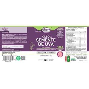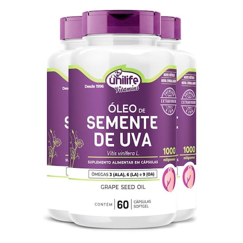Kit 3 óleo de semente de uva 1200mg unilife 60 cápsulas O óleo da semente de uva é um dos tipos de óleos vegetais prensados a frio. Esse tipo de extração de óleo é o mais demorado e também o mais oneroso de todos os processos. As sementes contidas nos frutas passam pro uma prensagem até que delas seja extraído um óleo 100% puro, que possui uma qualidade altíssima, preservando todas as propriedades nutricionais e medicinais dos produtos. Para se extrair 1 litro do óleo da semente de uva é necessário uma quantidade total de 30 quilos de sementes da uva.