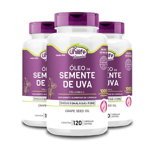 Kit 3 óleo de semente de uva 1200mg unilife 120 cápsulas Oleo de semente de uva 120 cápsulas 1200mg - unilife Cada cápsula contém 1.000mg de óleo de semente de uva.