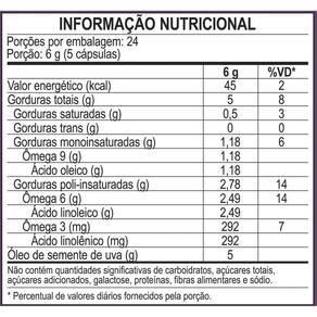 Possui ômega-6 e 9, além da vitamina e, que possui ação antioxidante nas células. Modo de ingestão: sugere-se a ingestão de 2 cápsulas ao dia, após a principal refeição. Ingerir com líquido. Ingredientes: óleo de semente de uva. Cápsula: gelatina bovina, umectante glicerina e água.