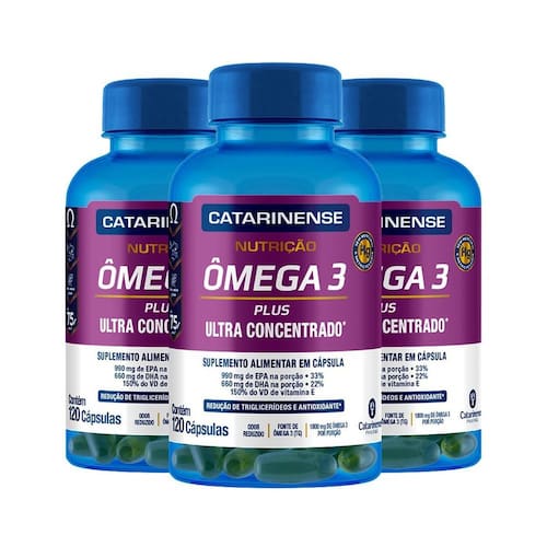 Kit 3 Ômega 3 Concentrado Catarinense 120 capsulas O produto Ômega 3 Concentrado Catarinense em cápsulas é um suplemento alimentar que contém ácidos graxos essenciais, como EPA e DHA, e vitamina E. Aqui está uma descrição detalhada das suas principais características: Finalidade de Uso: EPA 990 mg por porção : Auxilia na redução dos níveis de triglicérides no sangue, contribuindo para a saúde cardiovascular. DHA 660 mg por porção : Importante para a saúde cerebral e ocular. Vitamina E 150% do Valor Diário recomendado : Atua como um antioxidante, protegendo as células contra os danos causados pelos radicais livres. Consumo Recomendado: Dose diária: 3 cápsulas ao dia. Ingredientes: Óleo de Peixe: Fonte de EPA e DHA. Vitamina E Acetato de DL Alfa Tocoferol . Cápsula: Composta por água purificada, gelificante gelatina bovina INS 428 e umectante glicerina INS 422 . Informações Adicionais: Alergênicos: Contém derivados de peixe e pode conter soja. Não contém glúten. Este suplemento é indicado para quem deseja complementar a dieta com ômega 3 e vitamina E, visando benefícios cardiovasculares e antioxidantes. Produto dispensado de registro de acordo com a RDC 27/2010. Marca: Não Informado Ean: 7908609538920