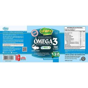 Kit 3 ômega 3 óleo de peixe 700mg unilife 120 cápsulas Ômega 3 unilife 120 cápsulas O melhor ômega 3 desodorizado O ômega 3 óleo de peixe possui diversos benefícios para saúde, ajudando a prevenir doenças no sistema cardiovascular. O corpo humano não é capaz de produzir ômega 3, tendo que obtê-lo da alimentação. O ômega 3, quando devidamente consumido, reduz o risco de desenvolver algumas doenças. É rico em ácido graxo poli-insaturado de cadeia longa epa e dha, livre de mercúrio e metais pesados, sem aditivos químicos e sem odor. Ômega 3 benefícios: O ômega 3 traz diversos benefícios à saúde, mais especificamente à cardiovascular; No organismo ajuda a desencadear efeitos de proteção ao coração; Atua nos triglicerídeos plasmáticos auxiliando na sua redução e como consequência auxilia na redução do total. Ômega 3 como tomar Sugere-se a ingestão de 2 a 4 cápsulas ao dia, após as refeições. Ingerir com líquido. Ingredientes do ômega 3 unilife Óleo de peixe. Cápsula: gelatina bovina e água. Omega 3 é extraído de peixes de escama, como a anchova e a sardinha. Cada cápsula contém 1000 mg de óleo de peixe, dos quais 195 mg são de ácido eicosapentaenoico epa e 122 mg são de ácido decosahexaenoico dha . Peso total da cápsula: 1200mg. Não contém glúten. Marca: Não Informado