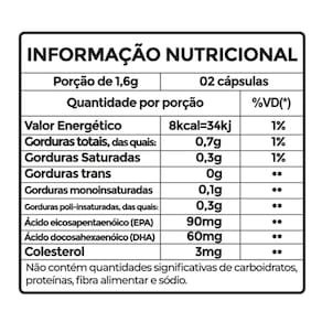 Ingredientes: Óleo de peixe, óleo de coco, maltitol, óleo de soja, glaceante cera de abelha, emulsificante lecitina de soja, edulcorantes sucralose e xilitol, óleo essencial de laranja e aroma natural de cereja. Composição da cápsula: gelatina, água purificada, umectante glicerina, edulcorante sucralose, corantes carmim e vermelho 40 e aroma natural de cereja. Não contém glúten
