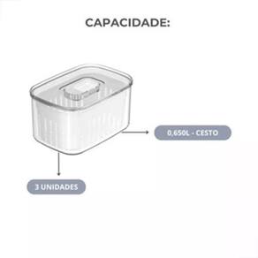 Aspen Decor F6274 Kit com 3 Organizador para Geladeira Clear Fresh com Cesto Legumes Frutas e Verduras Com o organizador de geladeira Clear Fresh com Cesto , você terá organização e irá conservar e manter o frescor de seus alimentos por mais tempo, a tampa com ventilação ajustável mantém o nível de umidade ideal para cada tipo de alimento, mantendo-os frescos por mais tempo. Possui um cesto de drenagem que impede que a umidade acumulada se mantenha no alimento, evitando o murchamento e deterioração precoce. Caracteristicas: - Material Bandeja - POLIPROPILENO; - Material Organizador - POLIENTIRENO; - Cor: Transparente; - Cesto para drenar agua dos alimentos; - Medidas 10 x 14,5 x 7,5cm Vantagens: - Ventilação e Humidade controlada; - Organização e otimização de espaço; - Com Cesto de Drenagem Removível; - Capacidade 0,65L. Acompanha: 03 Organizador Clear Fresh com Cesto 0,65L organizadores De Geladeira De Drenagem Com Respiradouro caixa de Armazenamento de Frutas Legumes E Vegetais conjunto Linha Clear Fresh OU Garantia do vendedor: 90 dias