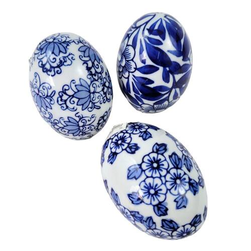 Composição: 3 ovos decorativos de porcelana Material: Porcelana de alta qualidade Cores: Azul e branco com detalhes florais delicados Peso: 140g cada Design clássico e sofisticado, ideal para a Páscoa