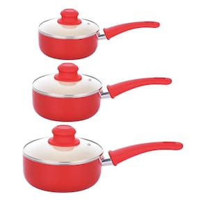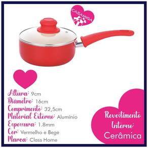 - Espessura: 1.8mm - Material: Alumínio com revestimento cerâmico - Marca: Class Home - Cor: Vermelho - Conteúdo: 3 Panelas