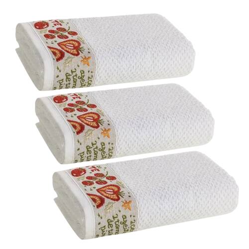 O que vem na embalagem: 3 Panos de Prato/Copa branco com barra decorativa em jacquard conforme imagem.
