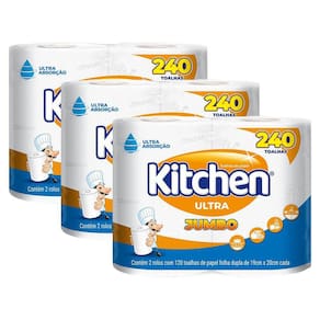 O Kit contém: 3 pacotes de Papel Toalha Kitchen Ultra Jumbo com 240 Folhas cada.
