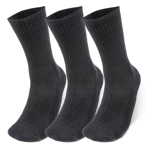Meias com mistura de algodão macio trazem leveza e conforto, perfeitas para o uso diário. Suporte de arco embutido reduz a fadiga do pé. Ainda conta com amortecimento para maior conforto sem sacrificar a respirabilidade. Com uma estrutura desenvolvida para moldar o calcanhar. Pacote com 3 pares de meias.