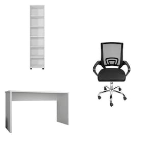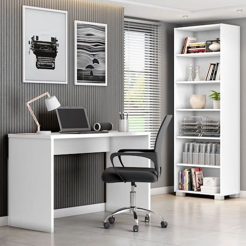O Conjunto é composto por uma cadeira, uma escrivaninha e uma Estante para Livros feitos com MDP para dar aquele ar de robustez e beleza. É a combinação perfeita e versátil para seu home office, combinando também com vários ambientes, desde um simples local para estudos até um escritório. A Mesa para Escritório possui design simples e elegante; O livreiro é ideal para guardar e ajudar a organizar os seus livros com 5 prateleiras (sendo 3 removíveis), tudo para deixar o seu ambiente harmonizado. As peças possuem as seguintes medidas: Escrivaninha Multiuso 16443.135: 75x127x53cm (AxLxP) Estante 16449.135: 189x63x39cm (AxLxP) Acabamento: Pintura UV Altura do Conjunto: 188 cm Ambiente: null Ambiente Principal: Escritório Cor: Branco Informação Complementar: 1x Escrivaninha Gávea Office 127cm Branco White Largura: 127 Largura: 127 cm Altura: 75 Altura: 75 cm Peso: 25 kg Profundidade: 53 cm Profundidade: 53 cm Necessita Montagem: Sim Necessita Montagem: Sim