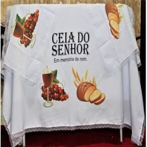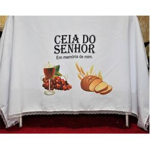 01 - toalha para mesa - medida: 1,5 x 1,5mt 01 - toalha para a bandeja de pão - medida: 40 x 50 cm 01 - toalha para a bandeja de cálices - medida: 40 x 50cm