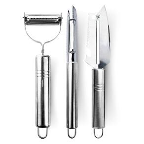 Composto por 3 Descascadores, Cortadores, Fatiadores Multifuncionais de Aço Inox, dentre de suas utilidades estão, bolear legumes e verduras, descascar, ralar, fatiar, cortar e muito mais.