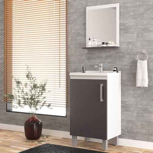 Conjunto com Gabinete, Espelho e Lavatório. Acabamento da Cuba: Polido Acabamento da Porta: BP Acabamento da Prateleira: BP Acompanha Cuba: Sim Acompanha Tampo: Sim Acompanha Válvula: Não Ambiente Principal: Banheiro codigo_ean: 7900288207418 Cor: Branco/Grafite Cor da Cuba: Branco Cor do Produto: Branco/Grafite Escala de Brilho: Polido Escala de Brilho da Porta: Fosco Escala de Brilho da Prateleira: Fosco Espessura do Espelho: 3 mm Formato da Cuba: Retangular Formato do Espelho: Retangular Formato Espelheira: Retangular Furação para Cuba e Torneira: Sim Itens Inclusos: 1 Gabinete, 1 Espelho e 1 Lavatório Manual de Montagem e Instalação: https://product-hub-prd.madeiramadeira.com.br/130857312/documents/1e2ee1f0-d386-40ab-9dba-c6fcb6b6e52a2905508572817465564843897.pdf Marca: Cewal Material da Cuba: Mármore Sintético Material da Porta: MDP Material da Prateleira: MDP Material do Tampo: Mármore Sintético Material Principal: MDP Medida da Cuba (C x L x P): 45x32x10 Medida da Espelheira (A x L x P): 45x39,5x10 Medida do Gabinete (A x L x P): 84x45x32 Necessita Montagem: Não Origem do Produto: Nacional Peso: 19 kg Peso Máximo por Prateleira: 5 kg Possui Espelheira: Sim Possui Gabinete: Sim Possui Gavetas: Não Possui iluminação: Não Possui Pés: Sim Possui Recorte No Tampo Para Misturador: Não Possui Rodízio: Não Possui Sifão: Não Possui Tampo: Não Produto Montado: Não Quantidade de Espelhos: 01 Recomendações de Uso, Manutenção e Limpeza: Não usar produtos abrasivos Suporte para Toalheiro: Não Tamanho do Espelho (A x L): 30x40 Tamanho do Gabinete: Pequeno: Abaixo de 60cm de largura Tipo de Cuba: Apoio/Sobrepor Tipo de Dobradiça/Corrediça da Porta: Metálica Tipo de Gabinete: Gabinete de Chão Tipo de Porta: Bater Tipo de Puxador da Porta: Externo Válvula indicada: 7/8" Marca: Não Informado