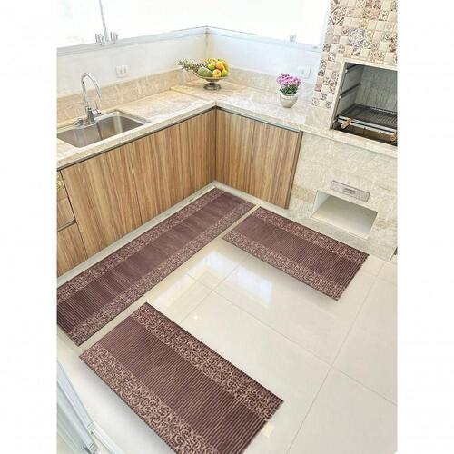 Composição do Kit:- 1 Passadeira de 0,50 x 1,50 m perfeita para frente da pia ou bancadas maiores- 2 Tapetes de 0,50 x 0,75 m ideais para frente do fogão e da geladeiraAs três peças combinam entre si, formando um conjunto harmonioso que protege o piso e valoriza a decoração do ambiente.
