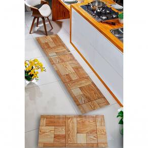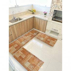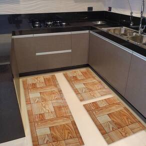 Composição do Kit:- 1 Passadeira em Manta Vinílica de 0,50x1,50 ideal para frente da pia ou balcão- 2 Tapetes Menores de 0,50x0,75 cada perfeitos para frente do fogão e da geladeiraAs três peças formam um conjunto harmônico que protege o piso e melhora o visual da sua cozinha sem sobrecarregar o ambiente.