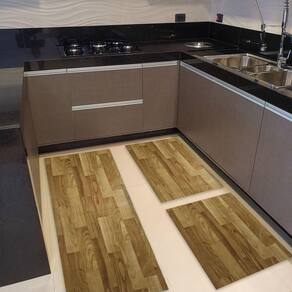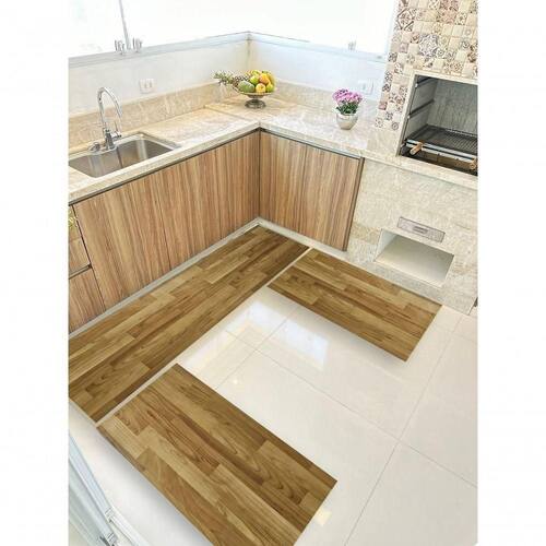 Composição do Kit:- 1 Passadeira em Manta Vinílica de 0,50x1,50 ideal para frente da pia ou balcão- 2 Tapetes Menores de 0,50x0,75 cada perfeitos para frente do fogão e da geladeiraAs três peças formam um conjunto harmônico que protege o piso e melhora o visual da sua cozinha sem sobrecarregar o ambiente.