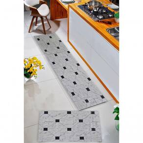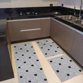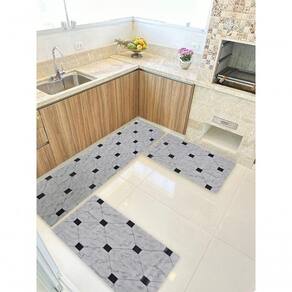 Composição do Kit:- 1 Passadeira em Manta Vinílica de 0,50x1,50 ideal para frente da pia ou balcão- 2 Tapetes Menores de 0,50x0,75 cada perfeitos para frente do fogão e da geladeiraAs três peças formam um conjunto harmônico que protege o piso e melhora o visual da sua cozinha sem sobrecarregar o ambiente.
