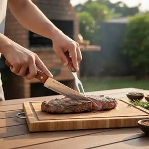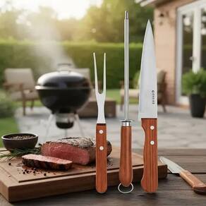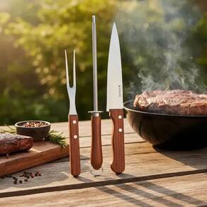 Kit 3 Peças Para Churrasco Açougue Faca Garfo Chaira Inox Kit 3 Peças Para Churrasco Açougue Faca Garfo Chaira Inox ===================================== Composto por três peças essenciais faca, chaira e garfo trinchante, este conjunto foi pensado para oferecer alto desempenho tanto no uso doméstico quanto . A faca de corte possui lâmina em aço inox de alta qualidade, garantindo cortes limpos, rápidos e eficientes, mesmo nas carnes mais resistentes. A chaira é perfeita para manter o fio da faca sempre alinhado, proporcionando cortes mais seguros e precisos. Já o garfo trinchante conta com dentes firmes e cabo ergonômico, ideal para firmar as peças de carne durante o corte ou servir com facilidade. Todos os cabos são feitos em polipropileno resistente, com pegada confortável e segura, mesmo em ambientes de calor e alta umidade. ===================================== Contém: 01 Faca 01 Garfo 01 Chaira Especificações: - Material: Aço Inox e Madeira - Medida Faca: 30cm x 2,5cm - Medida Chaira: 29cm x 2,5cm - Medida Garfo: 25,5cm x 2,5cm - Peso: 251 gramas ===================================== Devido à diferença entre monitores e iluminação diferentes, pode haver variação na tonalidade apresentada no anúncio. Medidas muito aproximadas. Marca: Não Informado